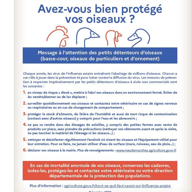 Les détenteurs de volailles doivent confiner ou protéger leurs oiseaux par des filets pour éviter tout contact avec la faune sauvage.