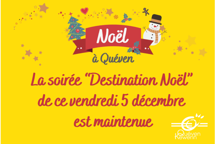 Malgré la météo maussade de cet après-midi, la ville de Quéven décide de maintenir le spectacle prévu à 19h place de Toulouse. Les modèles météo consultés prévoient une accalmie à partir de 18h30/19h. On ne vous promet pas du grand soleil, il y aura encore peut-être quelques gouttes et du vent mais… on vous garantit un beau spectacle Sons et lumières, du vin chaud et la chaleur humaine de tout ceux qui ont préparé cette soirée et de ceux qui viendront la partager ! Alors RDV à 19h place de Toulouse !
