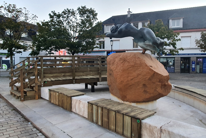 Installée en 1993 juste après l’aménagement de la place, l’œuvre de Georges Oudot (artiste français considéré comme un des représentants les plus significatifs de la sculpture figurative contemporaine) va trouver une nouvelle jeunesse. Baptisée le « Jaillissement », cette sculpture est devenue un symbole incontournable du centre-ville de Quéven. La symbolique de l’eau sera préservée et matérialisée par l’installation d’un pont de bois qui enjambera une petite rivière symbolisée par des galets. Pour la végétalisation, le choix s’est porté sur des plantes vivaces, peu gourmandes en eau, avec une dominante de couleurs qui variera selon les saisons.