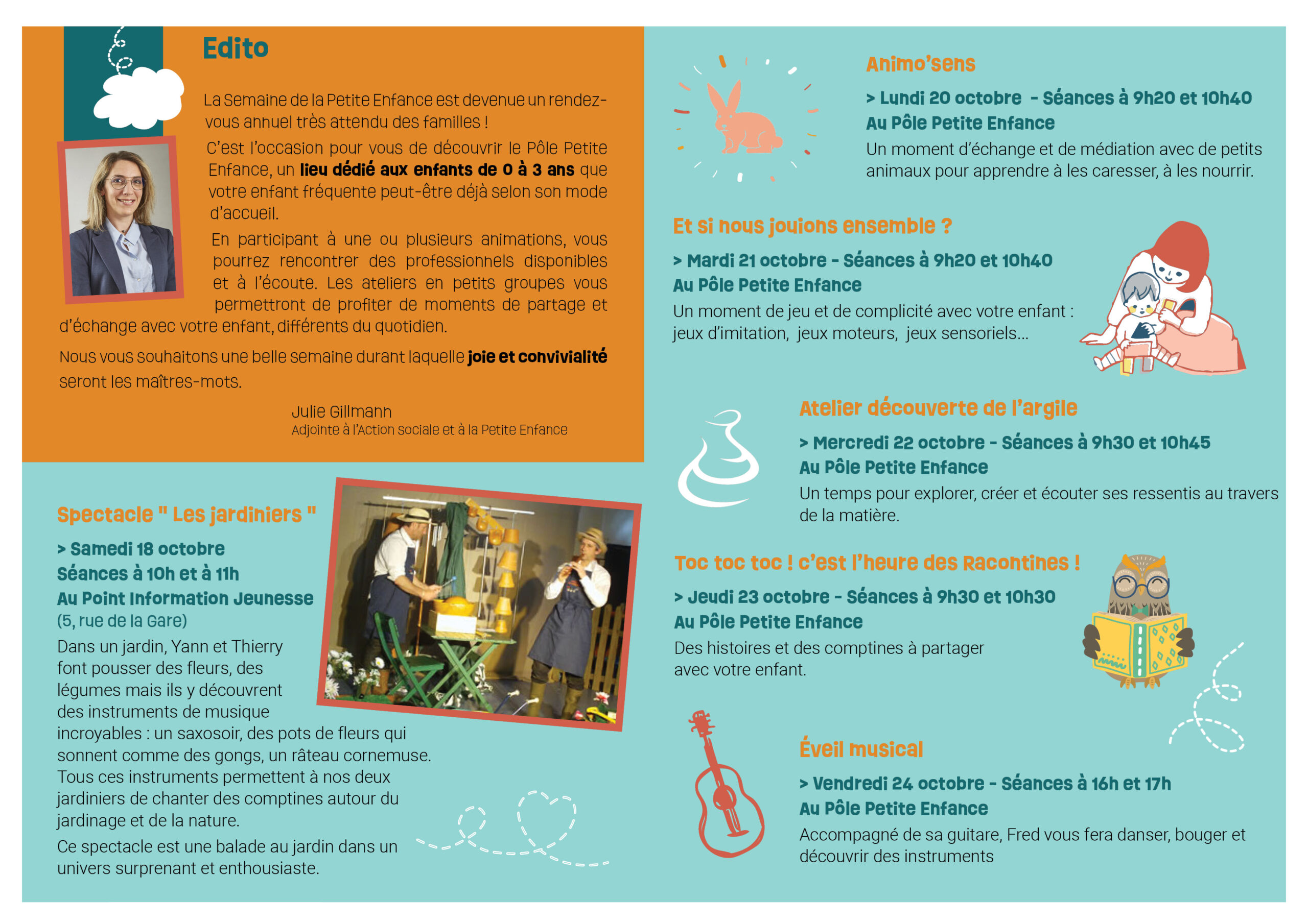 Du samedi 18 au vendredi 24 octobre 2025, le Pôle Petite Enfance propose un programme d’animations gratuites pour les tout-petits (0-3 ans) et les adultes qui les accompagnent (parents, grands-parents…). Spectacle, ateliers, jeux, échanges et rencontres avec des professionnels de la petite enfance.